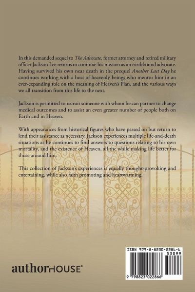 In this demanded sequel to The Advocate, former attorney and retired military officer Jackson Lee returns to continue his mission as an earthbound advocate. Having survived his own near death in the prequel Another Last Day he continues working with a host of heavenly beings who mentor him in an ever-expanding role on the meaning of Heaven's Plan, and the various ways we all transition from this life to the next. Jackson is permitted to recruit someone with whom he can partner to change medical outcomes and to assist an even greater number of people both on Earth and in Heaven. With appearances from historical figures who have passed on but return to lend their assistance as necessary, Jackson experiences multiple life-and-death situations as he continues to find answers to questions relating to his own mortality, and the existence of Heaven, all the while making life better for those around him. This collection of Jackson's experiences is equally thought-provoking and entertaining, while also faith promoting and heartwarming.