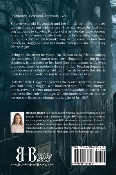 Fate may be unkind, but it decides one's destiny... Edinburgh, Scotland - February 1786 Sixteen-year-old Haggadah and her ill mother share an overcrowded apartment with others. They scavenge for food and beg for coins to survive. Rumors of a new bridge have become a reality. They must vacate their home before their tenement building is dismantled to make way for the construction. Now homeless, Haggadah and her mother sleep in a sheltered alley for the night. Living on the street for years, Tavish has many friends among the homeless. The young man sees Haggadah sitting in the shadows, is attracted to her kind face and mesmerizing eyes, and recognizes her mother's dire condition. Fearing Haggadah may become a victim of prostitution, Tavish turns to the elderly town healer, the only person he knows who can help. Unfortunately, Haggadah believes the healer is a witch, or worse yet, Half-Hangit Maggie, who murdered her infant, was hanged but survived. Tavish must convince Haggadah to escort her mother to the healer's cottage. Will she agree, unaware that the person she fears can change the course of her life?