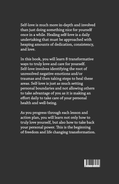 Self-love is much more in-depth and involved than just doing something nice for yourself once in a while. Healing self-love is a daily undertaking that must be approached with heaping amounts of dedication, consistency, and love. In this book, you will learn 8 transformative ways to truly love and care for yourself. Self-love involves identifying the root of unresolved negative emotions and/or traumas and then taking steps to heal these areas. Self-love is just as much setting personal boundaries and not allowing others to take advantage of you as it is making an effort daily to take care of your personal health and well-being. As you progress through each lesson and action plan, you will learn not only how to truly love yourself, but also how to take back your personal power. This is the beginning of freedom and life changing transformation.