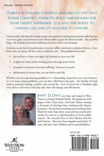 There is a dynamic formula available to you that shares comfort, strength, peace, and healing for your deepest sufferings. It is also the secret to eternal life, and it's available to anyone. God provides this formula so that people can experience healing for personal suffering, but you must apply each element to your life in order to gain the desired results. The payoff is huge: the healing of personal suffering no matter what your situation. Everyone needs this formula because everyone suffers emotional or physical distress. Even those who are dying will have time to find the cure. This guidebook provides · tips on how to listen and apply the formula to your own life; · insights on God's perfect healing power through Jesus Christ; · strategies to overcome personal suffering, whatever it may be; · information to ensure that you can find eternal life. Whether you are experiencing problems in a relationship, depression over your finances, or even more serious problems, you can have relief from your pain. The Healing Formula leads to personal healing, comfort, and eternal life. Even if you're not a Christian right now, there is still time to find the elixir that will change your life forever.