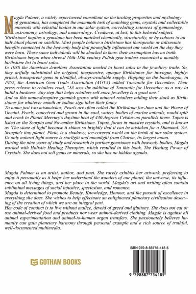Birthstones are believed to represent either the month of a person's birth or the zodiac sign. They were the brainchild of shrewd 16th -century gem traders to boost sales. Six hundred years later, The American Jewellers Association, the American Gem Society and the American Gem Trade Association have constantly changed the original, outdated, inexpensive list for expensive, fashionable gems. The Jewellers of America made this press release: "JA sees the addition of Tanzanite for December as a way to build business. Any step that helps retailers sell more jewellery is a good one." -obviously, it has nothing to do with focusing the healing energy of the planet of birth through physical contact. Incensed by this financial trickery, Magda studied and conferred with astronomers and astrologers before correlating astronomical facts with gemological research. Credace at last. Tabled in this book are Precious Gems, Crystals, Talismans and Bedside Rocks coupled with zodiac signs to lend the seeker harmony, strength, and balance. As with the lists of birthstones, minerals for healing were out of hand; the leading causes were for-profit and belief in fairy tales. Magda worked with healers using crystals, gemstones, and rocks for nine years before compiling the healing and traditional lists in The Healing Power of Crystals. Sceptics say there is no proof of improved awareness or healing qualities through crystals, yet a garden thrives using mineral additives, and so does the animal kingdom. The argument against the healing power of crystals could be that we don't consume them as we do pharmaceuticals. Ah, but the essential minerals for good health are Iron, Calcium, Magnesium, Zinc and Potassium, the constituents of many gemstones, and we know that science backs the remarkable ability of crystals to transform, amplify and transmit energy. Combine that with the human mind that possesses healing powers thanks to positive thought.
