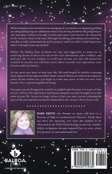 My dreams were instrumental in encouraging me to continue on my quest, guiding me along and giving me validations when I was feeling doubtful. By going deeper into that place within, I was able to find inner peace and discover the diamonds in the treasure chest of my soul. Through dreaming, journaling and analyzing, I was able to fully understand my soul's purpose, and I was able to find forgiveness where I thought none was needed. Within The Healing Power of Dreams are tips and suggestions to assist you in achieving dream recall so you can receive vital information, solve conflicts, and heal your life. As you continue to recall your dreams, not only will answers be revealed to you but you will learn more about yourself, your aspirations, your dreams, and your desires. As you open your heart to heal your life, life itself begins to unfold-exposing more aspects of you that you didn't know existed. When you unlock the immense power of love within you, you begin to evolve into more of who you were truly meant to be-a great magnificent being. Your past can not be ignored, avoided, or pushed aside because it is a part of who you are. All your life experiences and lessons along the way have brought you to this point in your life. As you no longer refuse to face your past, you are releasing the pain of the past and discovering the diamonds in the treasure chest of your soul.
