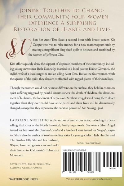 After her Aunt Teza's test results turn out to be inconclusive, Dot Cooper resolves to raise money for a new mammogram machine, through the creation and auction of a magnificent, king-sized quilt to be sewn by the women of Jefferson City. Dot's efforts quickly draw the support of disparate members of the community, including newcomer Beth Donnelly, married to a local pastor; Elaine Giovanni, the stylish wife of a local surgeon; and an ailing Aunt Teza. But as the four different generations work the squares of the quilt, they are also confronted with ragged pieces of their own lives. Though the women could not be more different on the surface, they hold in common quiet suffering triggered by painful circumstances: the death of children, the abandonment of husbands, the loneliness of depression. Yet their struggles will bring them closer together than they ever could have anticipated, and their lives will be dramatically changed, as together they experience the curative powers of The Healing Quilt.