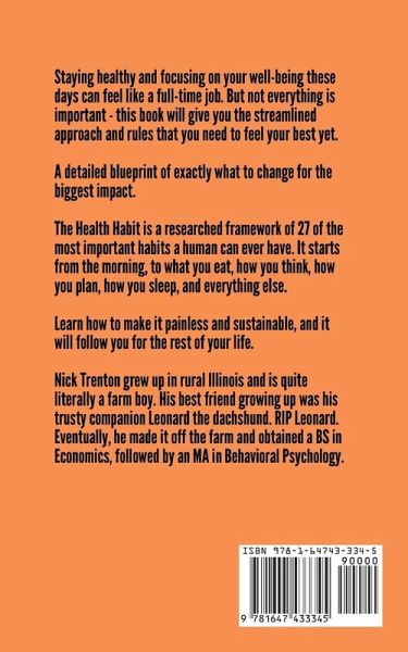 How to build a healthy lifestyle from scratch. Tweaks for waking up, sleeping, and everything in-between. Staying healthy and focusing on your well-being these days can feel like a full-time job. But not everything is important - this book will give you the streamlined approach and rules that you need to feel your best yet. A detailed blueprint of exactly what to change for the biggest impact. The Health Habit is a researched framework of 27 of the most important habits a human can ever have. It starts from the morning, to what you eat, how you think, how you plan, how you sleep, and everything else. Learn how to make it painless and sustainable, and it will follow you for the rest of your life. Change your habits, change your life. Learn how to without sacrificing everything you enjoy. Nick Trenton grew up in rural Illinois and is quite literally a farm boy. His best friend growing up was his trusty companion Leonard the dachshund. RIP Leonard. Eventually, he made it off the farm and obtained a BS in Economics, followed by an MA in Behavioral Psychology. Create the change you want in your life, don't wait anymore. * The importance of engaging physically in the mornings * How to make the toughest habits easier than ever * How to implement willpower both at home and at work * What kind of fitness and wellbeing manifesto you should write for yourself * The best way to wind down for the night * Rewarding yourself, celebrating, and keeping motivated * How to completely re-write your personal narrative for empowerment Learn how to make your body work for you, not against you.