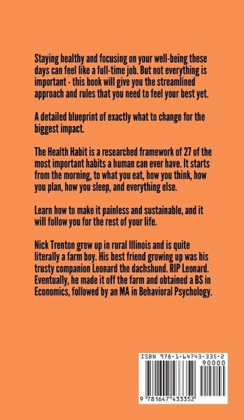 How to build a healthy lifestyle from scratch. Tweaks for waking up, sleeping, and everything in-between. Staying healthy and focusing on your well-being these days can feel like a full-time job. But not everything is important - this book will give you the streamlined approach and rules that you need to feel your best yet. A detailed blueprint of exactly what to change for the biggest impact. The Health Habit is a researched framework of 27 of the most important habits a human can ever have. It starts from the morning, to what you eat, how you think, how you plan, how you sleep, and everything else. Learn how to make it painless and sustainable, and it will follow you for the rest of your life. Change your habits, change your life. Learn how to without sacrificing everything you enjoy. Nick Trenton grew up in rural Illinois and is quite literally a farm boy. His best friend growing up was his trusty companion Leonard the dachshund. RIP Leonard. Eventually, he made it off the farm and obtained a BS in Economics, followed by an MA in Behavioral Psychology. Create the change you want in your life, don't wait anymore.The importance of engaging physically in the mornings How to make the toughest habits easier than ever How to implement willpower both at home and at work What kind of fitness and wellbeing manifesto you should write for yourself The best way to wind down for the night Rewarding yourself, celebrating, and keeping motivated How to completely re-write your personal narrative for empowerment Learn how to make your body work for you, not against you.