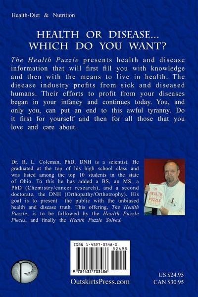 Health or disease...which do you want? The Health Puzzle presents health and disease information that will first fill you with knowledge and then with the means to live in health. The disease industry profits from sick and diseased humans. Their efforts to profit from your diseases began in your infancy and continues today. You, and only you, can put an end to this awful tyranny. Do it first for yourself and then for all those that you love and care about.