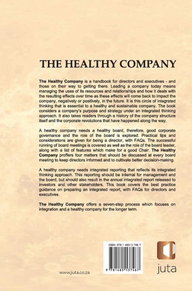 The Healthy Company is a handbook for directors and executives - and those on their way to getting there. Leading a company today means managing the uses of its resources and relationships and how it deals with the resulting effects over time as these effects will come back to impact the company, negatively or positively, in the future. It is this circle of integrated thinking that is essential to a healthy and sustainable company. The book considers a company's purpose and strategy under an integrated thinking approach. It also takes readers through a history of the company structure itself and the corporate revolutions that have happened along the way. A healthy company needs a healthy board, therefore, good corporate governance and the role of the board is explored. Practical tips and considerations are given for being a director, with FAQs. The successful running of board meetings is covered as well as the role of the board leader, along with a list of features which make for a good Chair. The Healthy Company proffers four matters that should be discussed at every board meeting to keep directors informed and to cultivate better decision-making. A healthy company needs integrated reporting that reflects its integrated thinking approach. This reporting should be internal for management and the board, but should also result in the annual integrated report released to investors and other stakeholders. This book covers the best practice guidance on preparing an integrated report, with FAQs for directors and executives. The Healthy Company offers a seven-step process which focuses on integration and a healthy company for the longer term.