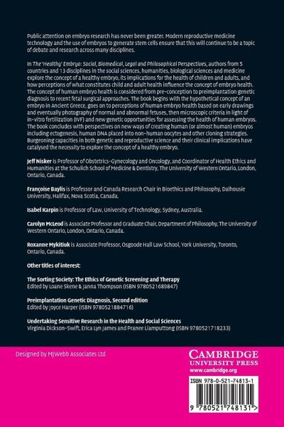Public attention on embryo research has never been greater. Modern reproductive medicine technology and the use of embryos to generate stem cells ensure that this will continue to be a topic of debate and research across many disciplines. This multidisciplinary book explores the concept of a 'healthy' embryo, its implications on the health of children and adults, and how perceptions of what constitutes child and adult health influence the concept of embryo 'health'. The concept of human embryo health is considered from preconception to pre-implantation genetic diagnosis to recent foetal surgical approaches. Burgeoning capacities in both genetic and reproductive science and their clinical implications have catalysed the necessity to explore the concept of a 'healthy' embryo. The authors are from five countries and 13 disciplines in the social sciences, humanities, biological sciences and medicine, ensuring that the book has a broad coverage and approach.