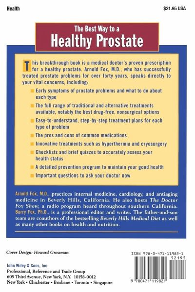 This breakthrough book is a medical doctor's proven prescription for a healthy prostate. Arnold Fox, M.D., who has successfully treated prostate problems for over forty years, speaks directly to your vital concerns, including: * Early symptoms of prostate problems and what to do about each type * The full range of traditional and alternative treatments available, notably the best drug-free, nonsurgical options * Easy-to-understand, step-by-step treatment plans for each type of problem * The pros and cons of common medications * Innovative treatments such as hyperthermia and cryosurgery * Checklists and brief quizzes to accurately assess your health status * A detailed prevention program to maintain your good health * Important questions to ask your doctor now