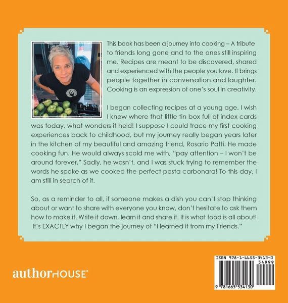 This book has been a journey into cooking - A tribute to friends long gone and to the ones still inspiring me. Recipes are meant to be discovered, shared and experienced with the people you love. It brings people together in conversation and laughter. Cooking is an expression of one's soul in creativity. I began collecting recipes at a young age. I wish I knew where that little tin box full of index cards was today, what wonders it held! I suppose I could trace my first cooking experiences back to childhood, but my journey really began years later in the kitchen of my beautiful and amazing friend, Rosario Patti. He made cooking fun. He would always scold me with, "pay attention - I won't be around forever." Sadly, he wasn't, and I was stuck trying to remember the words he spoke as we cooked the perfect pasta carbonara! To this day, I am still in search of it. So, as a reminder to all, if someone makes a dish you can't stop thinking about or want to share with everyone you know, don't hesitate to ask them how to make it. Write it down, learn it and share it. It is what food is all about! It's EXACTLY why I began the journey of "I learned it from my Friends."