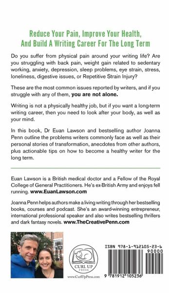 Do you suffer from physical pain relating to your writing life? Are you struggling with back pain, weight gain related to sedentary working, anxiety, depression, sleep problems, neck pain, eye strain, stress, loneliness, digestive issues, or Repetitive Strain Injury? These are the most common issues reported by writers and if you struggle with any of them, you are not alone. Writing is not a physically healthy job, but if you want a long-term writing career, then you need to look after your body. I've been through my own pain journey over the last six years. I used to get crippling migraines that sent me to a dark room, and back pain so bad that I couldn't sleep, as well as stress levels so high that I wasn't able to breathe normally. Now, my back pain, migraines and RSI have almost gone completely, and I manage my writing life in a far healthier way than ever before. I share my personal journey and insights with you in this book. My co-author is Dr Euan Lawson, who shares his insights into how we can reduce pain, improve health and build a writing career for the long term. The book covers: Introduction and survey results from 1200 writers 7 reasons why writing is great for your health Part 1: The Unhealthy Writer Stress, anxiety, burnout Back, neck and shoulder pain A personal journey to a pain-free back Repetitive Strain Injury (RSI) Writing with chronic pain Sedentary life and inactivity Sleep problems and insomnia Eye strain, headaches, and migraine A personal story of headaches and migraine Loneliness and isolation Weight gain or weight loss Joanna's Letter to Sugar Digestive issues and IBS A personal journey through IBS with FODMAP Mood and mental health Riding the waves: Writing with depression – by Dan Holloway Alcohol: The good, the bad, and the ugly Coffee and caffeine Supplements, substances, and nootropics Part 2: The Healthy Writer Improve your workspace Sort out your sleep Sort out your diet From fat to fit Sort out your back Lessons learned about writing from yoga How to use dictation for a healthier writing life The active writer mindset Strategies for the sofa-bound The active writer: Three golden rules The running writer: Three rookie mistakes Lessons learned about writing from walking 100km in a weekend Find a community Build well-being with mindfulness Develop healthy habits for the long-term Conclusion: Your turn, choose life! It's time to be a healthy writer!