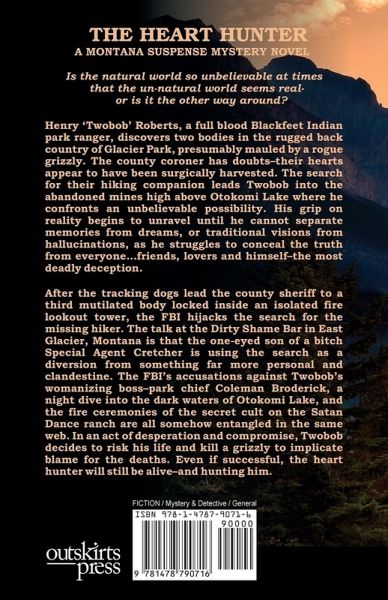 A rogue grizzly is blamed for the deaths of cattle along the border separating Glacier Park and the Blackfeet Indian Reservation. The repetitive nature suggests to Coleman Broderick, the Chief Park Ranger, that the mutilations are ceremonies of a cult squatting on a ranch called Satan Dance- maybe the next mutilation will be a person. When Park Ranger, Henry 'Twobob' Roberts, discovers two bodies on the rugged trail into Otokomi Lake, the mutilation similarities are obvious. The companion of the dead hikers is missing and after a third mutilated woman is found in an isolated fire lookout tower, the search for the lost hiker in Glacier Park becomes a deadly tangle of circumstances. FBI Agent Cretcher takes over the search, pursues his own vendetta and accuses Coleman of raping and murdering the woman in the fire tower. The rumor at the Dirty Shame Bar is that the FBI, using the lost hiker as a cover, is searching for something more clandestine. Despite the County Coroner's suggestion that all three hearts were harvested before the mutilations, Henry fabricates a blackmail scheme with Agent Cretcher and risks his life to kill a rogue grizzly to be blamed for the deaths. Even if he is successful, Henry knows that the heart hunter will still be alive- and hunting him.
