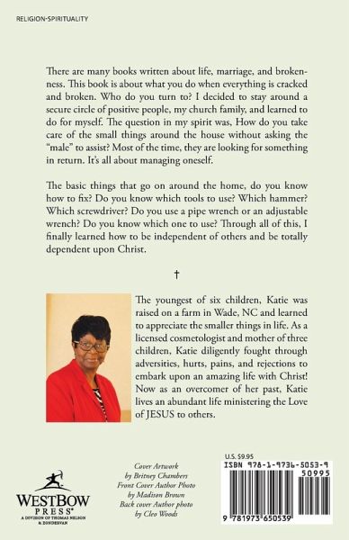 There are many books written about life, marriage, and brokenness. This book is about what you do when everything is cracked and broken. Who do you turn to? I decided to stay around a secure circle of positive people, my church family, and learned to do for myself. The question in my spirit was, How do you take care of the small things around the house without asking the "male" to assist? Most of the time, they are looking for something in return. It's all about managing oneself. The basic things that go on around the home, do you know how to fix? Do you know which tools to use? Which hammer? Which screwdriver? Do you use a pipe wrench or an adjustable wrench? Do you know which one to use? Through all of this, I finally learned how to be independent of others and be totally dependent upon Christ.