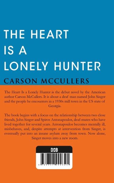 The Heart Is a Lonely Hunter is the debut novel by the American author Carson McCullers. It is about a deaf man named John Singer and the people he encounters in a 1930s mill town in the US state of Georgia. The book begins with a focus on the relationship between two close friends, John Singer and Spiros Antonapoulos, deaf-mutes who have lived together for several years. Antonapoulos becomes mentally ill, misbehaves, and, despite attempts at intervention from Singer, is eventually put into an insane asylum away from town. Now alone, Singer moves into a new room. The remainder of the narrative centers on the struggles of four of John Singer's acquaintances: Mick Kelly, a tomboy who loves music and dreams of buying a piano; Jake Blount, an alcoholic labor agitator; Biff Brannon, the observant owner of a diner; and Dr. Benedict Mady Copeland, an idealistic physician.