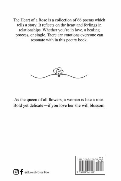 The Heart of a Rose is a collection of 66 poems which tells a story. It reflects on the heart and feelings in relationships. Whether you're in love, a healing process, or single. There are emotions everyone can resonate with in this poetry book.