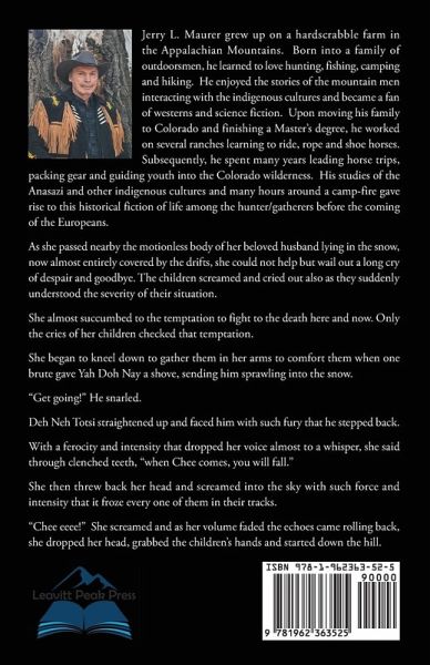 As she passed nearby the motionless body of her beloved husband lying in the snow, now almost entirely covered by the drifts, she could not help but wail out a long cry of despair and goodbye. The children screamed and cried out also as they suddenly understood the severity of their situation.She almost succumbed to the temptation to fight to the death here and now. Only the cries of her children checked that temptation.She began to kneel down to gather them in her arms to comfort them when one brute gave Yah Doh Nay a shove, sending him sprawling into the snow."Get going!" He snarled.Deh Neh Totsi straightened up and faced him with such fury that he stepped back.With a ferocity and intensity that dropped her voice almost to a whisper, she said through clenched teeth, "when Chee comes, you will fall."She then threw back her head and screamed into the sky with such force and intensity that it froze every one of them in their tracks."Chee eeee!" She screamed and as her volume faded the echoes came rolling back, she dropped her head, grabbed the children's hands and started down the hill.