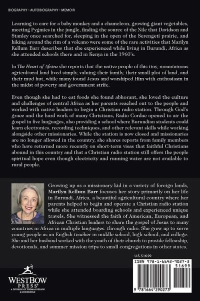 Learning to care for a baby monkey and a chameleon, growing giant vegetables, meeting Pygmies in the jungle, finding the source of the Nile that Davidson and Stanley once searched for, sleeping in the open of the Serengeti prairie, and hiking around the rim of a volcano were some of the rare activities that Marilyn Kellum Barr describes that she experienced while living in Burundi, Africa as she attended schools there and in Kenya in the 1960's. In The Heart of Africa she reports that the native people of this tiny, mountainous agricultural land lived simply, valuing their family, their small plot of land, and their mud hut, while many found Jesus and worshiped Him with enthusiasm in the midst of poverty and government strife. Even though she had to eat foods she found abhorant, she loved the culture and challenges of central Africa as her parents reached out to the people and worked with native leaders to begin a Christian radio station. Through God's grace and the hard work of many Christians, Radio Cordac opened to air the gospel in five languages, also providing a school where Burundian students could learn electronics, recording techniques, and other relevant skills while working alongside other missionaries. While the station is now closed and missionaries are no longer allowed in the country, she shares reports from family members who have returned more recently on short-term visas that faithful Christians abound in this country and that a Christian radio station still offers the people spiritual hope even though electricity and running water are not available to rural people.