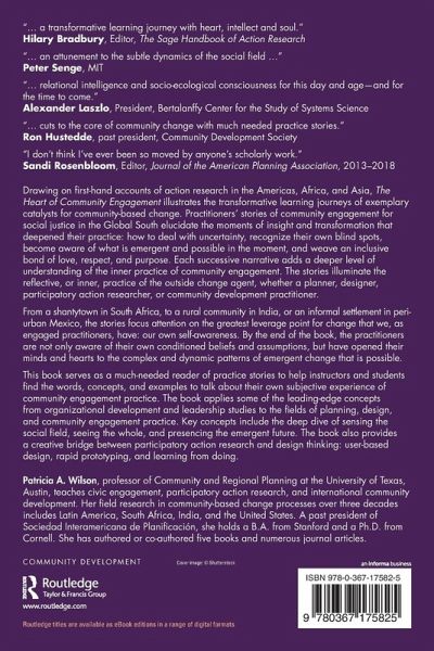 "Patricia Wilson is an action researcher and practitioner who tackles the often invisible and inner dimensions of community development- what she refers to as the feminine face of community engagement. Embodied in beautiful and rigorously told stories from around the globe, Patricia Wilson has distilled desperately needed practice wisdom." -Peter Westoby, University of Queensland, Australia, Author of Theory and Practice of Dialogical Community Development (Routledge)