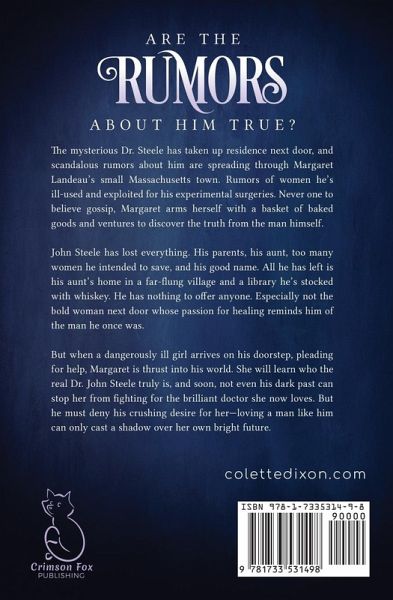 Are the rumors about him true? She intends to find out. The mysterious Dr. Steele has taken up residence next door, and scandalous rumors about him are spreading through Margaret Landeau's small Massachusetts town. Rumors of women he's ill-used and exploited for his experimental surgeries. Never one to believe gossip, Margaret arms herself with a basket of baked goods and ventures to discover the truth from the man himself. John Steele has lost everything. His parents, his aunt, too many women he intended to save, and his good name. All he has left is his aunt's home in a far-flung village and a library he's stocked with whiskey. He has nothing to offer anyone. Especially not the bold woman next door whose passion for healing reminds him of the man he once was. When a dangerously ill girl arrives on his doorstep, pleading for help, Margaret is thrust into his world. She will learn who the real Dr. John Steele truly is, and soon, not even his dark past can stop her from fighting for the brilliant doctor she now loves. But he must deny his crushing desire for her-loving a man like him can only cast a shadow over her own bright future.