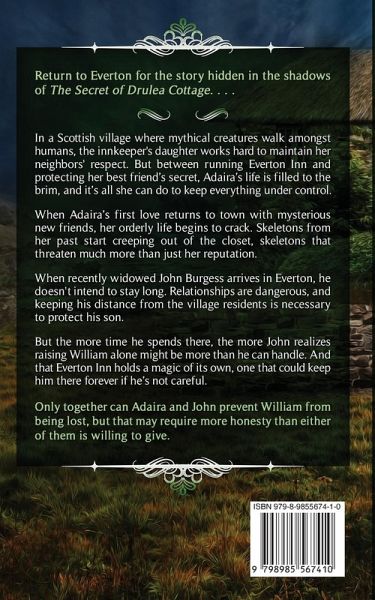 An innkeeper afraid of love. A widowed farmer desperate to protect his unusual son. Will their shared hurts heal or destroy each other? Return to Everton for the story hidden in the shadows of The Secret of Drulea Cottage. . . . In a Scottish village where mythical creatures walk amongst humans, the innkeeper's daughter works hard to maintain her neighbors' respect. But between running Everton Inn and protecting her best friend's secret, Adaira's life is filled to the brim, and it's all she can do to keep everything under control. When Adaira's first love returns to town with mysterious new friends, her orderly life begins to crack. Skeletons from her past start creeping out of the closet, skeletons that threaten much more than just her reputation. When recently widowed John Burgess arrives in Everton, he doesn't intend to stay long. Relationships are dangerous, and keeping his distance from the village residents is necessary to protect his son. But the more time he spends there, the more John realizes raising William alone might be more than he can handle. And that Everton Inn holds a magic of its own, one that could keep him there forever if he's not careful. Only together can Adaira and John prevent William from being lost, but that may require more honesty than either of them is willing to give.