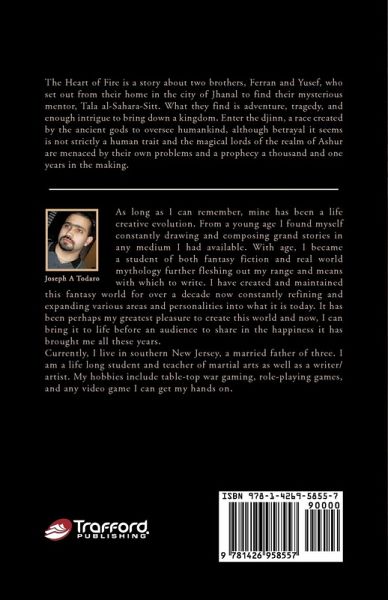 The Heart of Fire is a story about two brothers, Ferran and Yusef, who set out from their home in the city of Jhanal to find their mysterious mentor, Tala al-Sahara-Sitt. What they find is adventure, tragedy, and enough intrigue to bring down a kingdom. Enter the djinn, a race created by the ancient gods to oversee humankind, although betrayal, it seems, is not strictly a human trait and the magical lords of the realm of Ashur are menaced by their own problems and a prophecy a thousand and one years in the making.