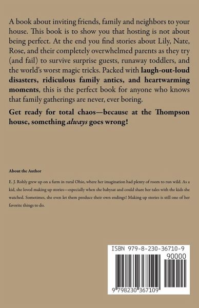 A book about inviting friends, family and neighbors to your house. This book is to show you that hosting is not about being perfect. At the end you find stories about Lily, Nate, Rose, and their completely overwhelmed parents as they try (and fail) to survive surprise guests, runaway toddlers, and the world's worst magic tricks. Packed with laugh-out-loud disasters, ridiculous family antics, and heartwarming moments, this is the perfect book for anyone who knows that family gatherings are never, ever boring. Get ready for total chaos-because at the Thompson house, something always goes wrong!