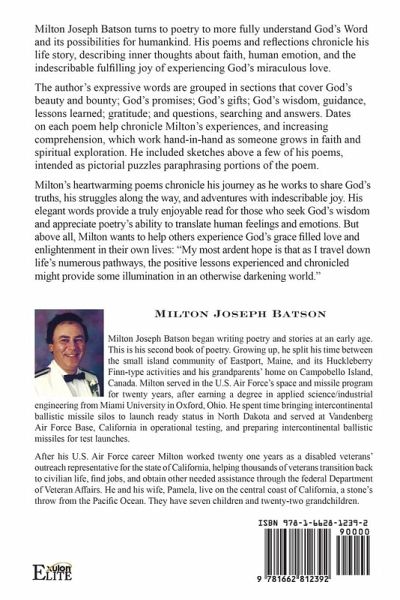 The author's expressive words are grouped into eight sections depicting examples of Gods Beauty and bounty; God's promises; God's gifts; God's wisdom, guidance, lessons learned; In gratitude; Questions, searching, answers; Love; and Inspiration. Milton included corresponding Bible verses on the title page of each section. Dates on each poem help chronicle his ongoing life experiences and increasing comprehension, which work hand in hand as someone grows in faith and spiritual exploration. He included sketches above a few of his poems, intended as pictorial puzzles paraphrasing portions of the poem. Through a profound and inspiring book of poetry and prose, the author shares the depths of God's love by revealing the intricacies of the facets of God's nature. With personal stories, revelation of God's heart, and glimpses of His beauty through nature, the author magnifies the wonder and majesty of a life lived with God by sharing his continuing increase in comprehension through the pages of The Heart of Milton, Poetic Prayer, Love, Inspiration - Book Two. The author's work is wonderfully and effectively organized, with the author's beautiful poetry and writings ordered according to theme and subject matter. This organization helps the collection of poetic works to have a natural and logical flow. Mr. Batson has been writing poetry and putting his thoughts on paper since he was a young child on his beloved islands of Eastport, Maine, and Campobello, Canada. This compilation traces the changes from childhood through present day and depicts his very heart, revealing innermost feelings and observations about life's lessons, adventures, joy, ardent hopes, trials and tribulations. His most ardent hope is that as he travels down life's numerous pathways the positive lessons learned will provide some illumination in a darkening world. Born in St. Stephens, New Brunswick, Mr. Batson was raised between Eastport, Maine, a small island community, where he enjoyed a Huckleberry Finn type lifestyle, roaming on frequent adventures with his best friend Paul Thompson, and Campobello Island, where his father was a friend of Theodore Roosevelt. Milton enjoys occasionally returning to Eastport for the Fourth of July celebration, which he says feels like going back to early 1900's America.