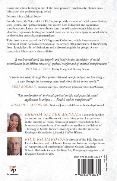 Racial and ethnic hostility is one of the most pervasive problems the church faces. It hinders our effectiveness as one body of believers. It damages our witness. Why won't this problem just go away?Because it is a spiritual battle.In response, we must employ spiritual weapons--prayer, repentance, forgiveness. In this book Brenda Salter McNeil and Rick Richardson provide a model of racial reconciliation, social justice, and spiritual healing that creates both individual and communal transformation. Read this book if you want to learn how to * use your faith as a force for change, not as a smoke screen for self-protection * embrace your true self and renounce false racial identities * receive and extend forgiveness as an act of racial reconciliation * experience personal transformation through the healing of painful racial memories * engage in social action by developing ongoing crosscultural partnerships This classic is now part of the IVP Signature Collection, which features special editions of iconic books in celebration of the seventy-fifth anniversary of InterVarsity Press. It includes a list of definitions and a discussion and activity guide for groups. A new companion Bible study is also available.