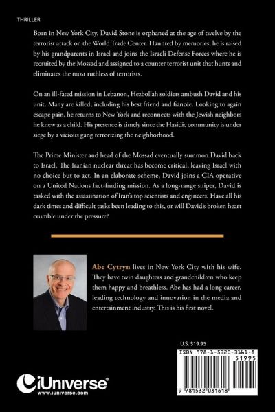 Born in New York City, David Stone is orphaned at the age of twelve by the terrorist attack on the World Trade Center. Haunted by memories, he is raised by his grandparents in Israel and joins the Israeli Defense Forces where he is recruited by the Mossad and assigned to a counter terrorist unit that hunts and eliminates the most ruthless of terrorists. On an ill-fated mission in Lebanon, Hezbollah soldiers ambush David and his unit. Many are killed, including his best friend and fiancée. Looking to again escape pain, he returns to New York and reconnects with the Jewish neighbors he knew as a child. His presence is timely since the Hasidic community is under siege by a vicious gang terrorizing the neighborhood. The Prime Minister and head of the Mossad eventually summon David back to Israel. The Iranian nuclear threat has become critical, leaving Israel with no choice but to act. In an elaborate scheme, David joins a CIA operative on a United Nations fact-finding mission. As a long-range sniper, David is tasked with the assassination of Iran’s top scientists and engineers. Have all his dark times and difficult tasks been leading to this, or will David’s broken heart crumble under the pressure?