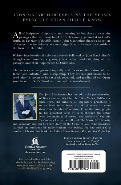 A Devotional, Verse-Memorization Journey Through 52 Key Passages of Scripture. *This 52-week guide through the heart of Scripture is designed so that you can start it at any point in the year. All of Scripture is important and meaningful, but there are certain passages throughout the 66 books that make up our Bible which are especially helpful for understanding and becoming grounded in God's truth. In The Heart of the Bible, Pastor John MacArthur shares a selection of verses that he believes are most significant as he helps you unpack their meaning and encourages you to memorize them--one per week for a full year. Written in a devotional style, each verse--taken from both the Old and New Testaments--is followed by John MacArthur's thoughts and comments, giving you a deeper understanding of the passages and their importance to Christians. The verses focus on the nature of the Bible, God, salvation, and discipleship, and are categorized topically. Some of the topics covered are: Knowing and trusting our great God. What happened at the cross. Accepting God's salvation. Living worthy of our calling. What it means to follow Jesus. These treasured pieces of Scripture are not just meant to be read--they're meant to be savored, repeated, meditated on, and memorized. Open your heart to God's Word and you will be transformed.