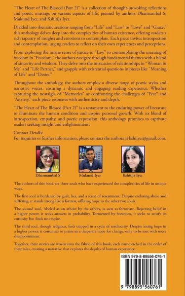 "The Heart of The Blessed (Part 2)" is a collection of thought-provoking reflections and poetic musings on various aspects of life, penned by authors Dharmambal S, Mukund Iyer, and Kshitija Iyer. Divided into thematic sections ranging from "Life" and "Law" to "Love" and "Grace," this anthology delves deep into the complexities of human existence, offering readers a rich tapestry of insights and emotions to contemplate. Throughout the anthology, the authors employ a diverse range of poetic styles and narrative voices, ensuring a dynamic and engaging reading experience. Whether capturing the nostalgia of "Memories" or confronting the challenges of "Fear" and "Anxiety," each piece resonates with authenticity and depth. "The Heart of The Blessed (Part 2)" is a testament to the enduring power of literature to illuminate the human condition and inspire personal growth. With its blend of introspection, empathy, and poetic expression, this anthology promises to captivate readers seeking insight and enlightenment.