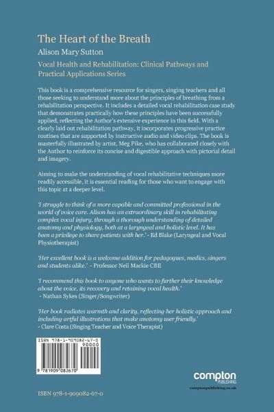 This book is a comprehensive resource for singers, singing teachers and all those seeking to understand more about the principles of breathing from a rehabilitation perspective. It includes a detailed vocal rehabilitation case study that demonstrates practically how these principles have been successfully applied, reflecting the Author's extensive experience in this field. With a clearly laid out rehabilitation pathway, it incorporates progressive practice routines that are supported by instructive audio and video clips. The book is masterfully illustrated by artist, Meg Pike, who has collaborated closely with the author to reinforce its concise and digestible approach with pictorial detail and imagery. Aiming to make the understanding of vocal rehabilitative techniques more readily accessible, it is essential reading for those who want to engage with this topic at a deeper level.