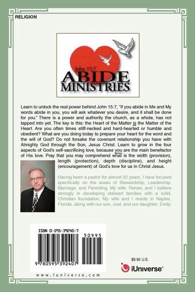 Learn to unlock the real power behind John 15:7, "If you abide in Me and My words abide in you, you will ask whatever you desire, and it shall be done for you." There is a power and authority the church, as a whole, has not tapped into yet. The key is this: the Heart of the Matter is the Matter of the Heart. Are you often times stiff-necked and hard-hearted or humble and obedient? What are you doing today to prepare your heart for the word and the will of God? Do not forsake the covenant relationship you have with Almighty God through the Son, Jesus Christ. Learn to grow in the four aspects of God's self-sacrificing love, because you are the main benefactor of His love. Pray that you may comprehend what is the width (provision), length (protection), depth (discipline), and height (encouragement) of God's love for us in Christ Jesus.