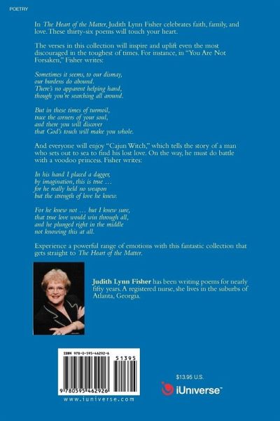 In The Heart of the Matter, Judith Lynn Fisher celebrates faith, family, and love. These thirty-six poems will touch your heart. The verses in this collection will inspire and uplift even the most discouraged in the toughest of times. For instance, in "You Are Not Forsaken," Fisher writes: Sometimes it seems, to our dismay, our burdens do abound. There's no apparent helping hand, though you're searching all around. But in these times of turmoil, trace the corners of your soul, and there you will discover that God's touch will make you whole. And everyone will enjoy "Cajun Witch," which tells the story of a man who sets out to sea to find his lost love. On the way, he must do battle with a voodoo princess. Fisher writes: In his hand I placed a dagger, by imagination, this is true . for he really held no weapon but the strength of love he knew. For he knew not . but I knew sure, that true love would win through all, and he plunged right in the middle not knowing this at all. Experience a powerful range of emotions with this fantastic collection that gets straight to The Heart of the Matter.