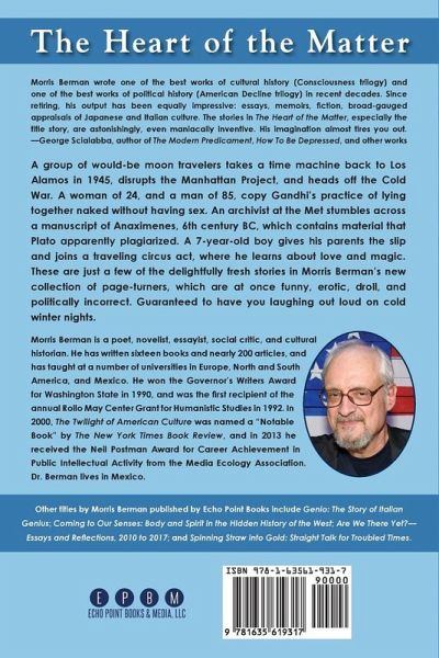 The Heart of the Matter Morris Berman wrote one of the best works of cultural history (the "Consciousness" trilogy) and one of the best works of political history (the "American Decline" trilogy) in recent decades. Since retiring, his output has been equally impressive: essays, memoirs, fiction, broad-gauged appraisals of Japanese and Italian culture. The stories in The Heart of the Matter, especially the title story, are astonishingly, even maniacally inventive. His imagination almost tires you out. --George Scialabba, author of The Modern Predicament, How To Be Depressed, and other works A group of would-be moon travelers takes a time machine back to Los Alamos in 1945, disrupts the Manhattan Project, and heads off the Cold War. A woman of 24, and a man of 85, copy Gandhi's practice of lying together naked without having sex. An archivist at the Met stumbles across a manuscript of Anaximenes, 6th century BC, which contains material that Plato apparently plagiarized. A 7-year-old boy gives his parents the slip and joins a traveling circus act, where he learns about love and magic. These are just a few of the delightfully fresh stories in Morris Berman's new collection of page-turners, which are at once funny, erotic, droll, and politically incorrect. Guaranteed to have you laughing out loud on cold winter nights. Morris Berman is the author of a number of books. His latest works, published by Echo Point Books, include Genio: The Story of Italian Genius; Coming to Our Senses: Body and Spirit in the Hidden History of the West; Are We There Yet?—Essays and Reflections, 2010 to 2017; and Spinning Straw into Gold: Straight Talk for Troubled Times.