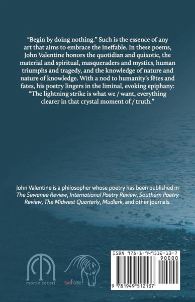 "Begin by doing nothing." Such is the essence of any art that aims to embrace the ineffable. In these poems, John Valentine honors the quotidian and quixotic, the material and spiritual, masqueraders and mystics, human triumphs and tragedy, and the knowledge of nature and nature of knowledge. With a nod to humanity's fêtes and fates, his poetry lingers in the liminal, evoking epiphany: "The lightning strike is what we / want, everything clearer in that crystal moment of / truth."