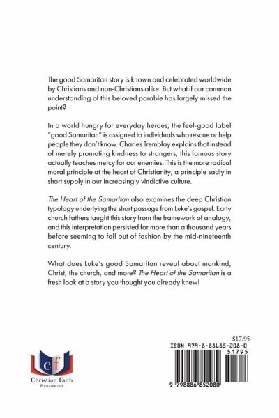 The good Samaritan story is known and celebrated worldwide by Christians and non-Christians alike. But what if our common understanding of this beloved parable has largely missed the point? In a world hungry for everyday heroes, the feel-good label "good Samaritan" is assigned to individuals who rescue or help people they don't know. Charles Tremblay explains that instead of merely promoting kindness to strangers, this famous story actually teaches mercy for our enemies. This is the more radical moral principle at the heart of Christianity, a principle sadly in short supply in our increasingly vindictive culture. The Heart of the Samaritan also examines the deep Christian typology underlying the short passage from Luke's gospel. Early church fathers taught this story from the framework of analogy, and this interpretation persisted for more than a thousand years before seeming to fall out of fashion by the mid-nineteenth century. What does Luke's good Samaritan reveal about mankind, Christ, the church, and more? The Heart of the Samaritan is a fresh look at a story you thought you already knew!