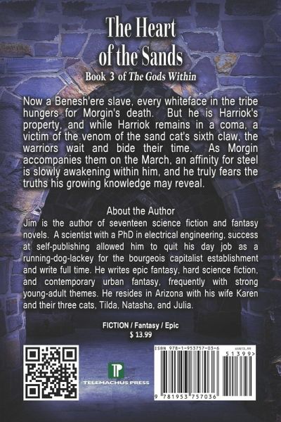 Now a Benesh'ere slave, every whiteface in the tribe hungers for Morgin's death. But he is Harriok's property, and while Harriok remains in a coma, a victim of the venom of the sand cat's sixth claw, the warriors wait and bide their time. As Morgin accompanies them on the March, an affinity for steel is slowly awakening within him, and he truly fears the truths his growing knowledge may reveal.Rhianne, thinking Morgin is dead, leads a lonely life as a hedge witch in a small village near the Lake of Sorrows. But as she matures, her powers grow far beyond those of a mere village healer. She now has a personal connection to the deadly talismanic sword Morgin brought onto the Mortal Plane, and as she begins to glean its true nature, she fears the fate of all mankind.As summer approaches and the heat of the sands of the Munjarro grows unbearable, the Benesh'ere are in the midst of their annual migration to the Lake of Sorrows. During the two days it takes to cross the Plains of Quam, their column is repeatedly attacked by companies of Kulls, a game of sport for the halfmen. Morgin fights beside the Benesh'ere to protect the column, and he reluctantly develops empathy for the whitefaces and their way of life.Morgin knows he must overcome Jerst and Blesset's hatred of him, and he regrets the heated words he threw at them shortly before the battle at Csairne Glen. But his only recourse may be to fight them in individual, mortal combat. And as he tries to find a resolution to that situation, he has no idea that he must again face Salula.For thrice and thrice must a blade be born.