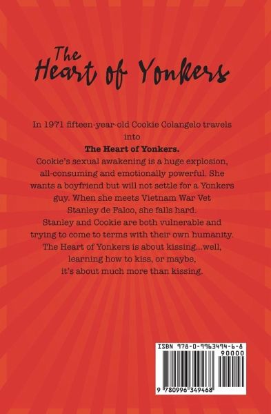 From the edge of the Hudson River, we travel with fifteen year old Cookie Colangelo into The Heart of Yonkers. Close to the river's edge, it was hot enough to take your clothes off and think about jumping into the water. Cookie has been slow to mature sexually. When her sexual awakening does occur, it's a huge explosion, all-consuming and emotionally powerful. She desperately wants a boyfriend but will not settle for a dumb Yonkers guy. Then she meets Stanley de Falco and falls hard. This Vietnam War Vet has recently returned home. Stanley is vulnerable and trying to come to terms with his own humanity. While Cookie does everything in her power to seduce him, her age is an obstacle to consummating the relationship. Throughout this story, the presence of the river is a brilliant metaphor providing context for unforgettable characters. Ultimately, The Heart of Yonkers is about kissing…well, learning how to kiss, or maybe, it's about much more than kissing.