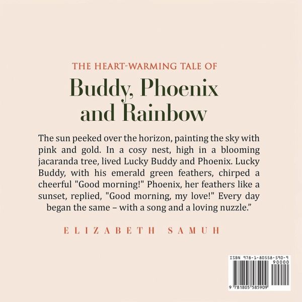 In a serene forest nestled high in the branches of a blooming jacaranda tree, two lovebirds, Lucky Buddy and Phoenix, fill each day with song, laughter, and unwavering devotion. Their melodies dance through the air, a testament to the harmony they share. But when a new voice, rich and vibrant, drifts through the trees, their perfect world is gently stirred. Enter Rainbow, a dazzling lovebird with shimmering feathers and a song unlike any they've heard before. As curiosity overcomes fear, Lucky Buddy and Phoenix embark on a journey of discovery-one that teaches them love is not just for two, but something that can grow, expand, and shine even brighter when shared. A heartwarming tale of friendship, trust, and the beauty of opening one's heart to new connections, Lucky Buddy and Phoenix reminds us that love, like music, becomes even more magical when we embrace the unexpected.