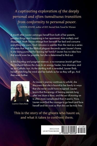 A month after Lauren estranges herself from both of her parents, peculiar things start happening in her apartment. Ants multiply and disappear. Moth larvae emerge from beneath her bed and consume everything she owns. Each intrusion is weirder than the next as a series of events that rival the Biblical plagues descends upon Lauren's home. Is she being punished for leaving her family? Lauren has no idea how that would even be possible, but she is determined to find out. In this haunting and poignant memoir, a no-nonsense Jewish girl from the Midwest follows the clues to an energy healer, two shamans, and an ex-Catholic nun. As the startling truth is revealed, Lauren finds herself stretching her mind and her beliefs as far as they will go. And then even further. As Lauren's journey continues to unfold, she discovers that she is bound to her family in ways that she never could have imagined. Lauren learns that the energy of leaving persists long after we close a door, and the act of moving on is often more complicated than it seems. Now, Lauren must find the courage to go back and face herself and her roots so that she can be truly free. This is the story of the ghosts who haunt us, and what it takes to confront them.
