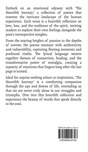 Embark on an emotional odyssey with "The Heartfelt Journey," a collection of poems that traverse the intricate landscape of the human experience. Each verse is a heartfelt reflection on love, loss, and the resilience of the spirit, inviting readers to explore their own feelings alongside the poet's introspective insights. From the soaring heights of passion to the depths of sorrow, the poems resonate with authenticity and vulnerability, capturing fleeting moments and profound truths. The lyrical language weaves together themes of connection, healing, and the transformative power of nostalgia, creating a tapestry of emotions that lingers long after the last page is turned. Ideal for anyone seeking solace or inspiration, "The Heartfelt Journey" is a comforting companion through the ups and downs of life, reminding us that we are never truly alone in our struggles and triumphs. Dive into this heartfelt collection and experience the beauty of words that speak directly to the soul.