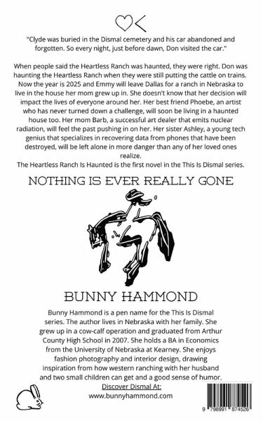 "Clyde was buried in the Dismal cemetary and his car abandoned and forgotten. So every night, just before dawn, Don visited the car." When people said the Heartless Ranch was haunted, they were right. Don was haunting the Heartless Ranch when they were still putting the cattle on trains. Now the year is 2025 and Emmy will leave Dallas for a ranch in Nebraska to live in the house her mom grew up in. She doesn't know that her decision will impact the lives of everyone around her. Her best friend Phoebe, an artist who has never turned down a challenge, will soon be living in a haunted house too. Her mom Barb, a successful art dealer that emits nuclear radiation, will feel the past pushing in on her. Her sister Ashley, a young tech genius that specializes in recovering data from phones that have been destroyed, will be left alone in more danger than any of her loved ones realize. The Heartless Ranch Is Haunted is the first novel in the This Is Dismal series. Nothing is ever really gone.