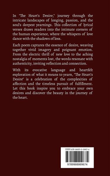 In "The Heart's Desire," journey through the intricate landscapes of longing, passion, and the soul's deepest yearnings. This collection of lyrical verses draws readers into the intimate corners of the human experience, where the whispers of love dance with the shadows of loss. Each poem captures the essence of desire, weaving together vivid imagery and poignant emotion. From the electric thrill of new love to the aching nostalgia of moments lost, the words resonate with authenticity, inviting reflection and connection. With its evocative language and heartfelt exploration of what it means to yearn, "The Heart's Desire" is a celebration of the complexities of affection and the timeless pursuit of fulfillment. Let this book inspire you to embrace your own desires and discover the beauty in the journey of the heart.