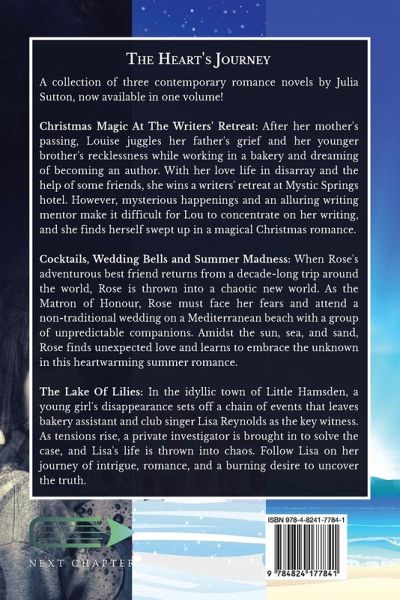 A collection of three contemporary romance novels by Julia Sutton, now available in one volume! Christmas Magic At The Writers' Retreat: After her mother's passing, Louise juggles her father's grief and her younger brother's recklessness while working in a bakery and dreaming of becoming an author. With her love life in disarray and the help of some friends, she wins a writers' retreat at Mystic Springs hotel. However, mysterious happenings and an alluring writing mentor make it difficult for Lou to concentrate on her writing, and she finds herself swept up in a magical Christmas romance. Cocktails, Wedding Bells and Summer Madness: When Rose's adventurous best friend returns from a decade-long trip around the world, Rose is thrown into a chaotic new world. As the Matron of Honour, Rose must face her fears and attend a non-traditional wedding on a Mediterranean beach with a group of unpredictable companions. Amidst the sun, sea, and sand, Rose finds unexpected love and learns to embrace the unknown in this heartwarming summer romance. The Lake Of Lilies: In the idyllic town of Little Hamsden, a young girl's disappearance sets off a chain of events that leaves bakery assistant and club singer Lisa Reynolds as the key witness. As tensions rise, a private investigator is brought in to solve the case, and Lisa's life is thrown into chaos. Follow Lisa on her journey of intrigue, romance, and a burning desire to uncover the truth.