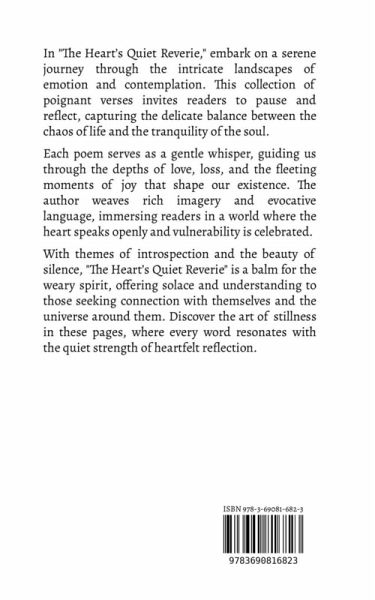 In "The Heart's Quiet Reverie," embark on a serene journey through the intricate landscapes of emotion and contemplation. This collection of poignant verses invites readers to pause and reflect, capturing the delicate balance between the chaos of life and the tranquility of the soul. Each poem serves as a gentle whisper, guiding us through the depths of love, loss, and the fleeting moments of joy that shape our existence. The author weaves rich imagery and evocative language, immersing readers in a world where the heart speaks openly and vulnerability is celebrated. With themes of introspection and the beauty of silence, "The Heart's Quiet Reverie" is a balm for the weary spirit, offering solace and understanding to those seeking connection with themselves and the universe around them. Discover the art of stillness in these pages, where every word resonates with the quiet strength of heartfelt reflection.