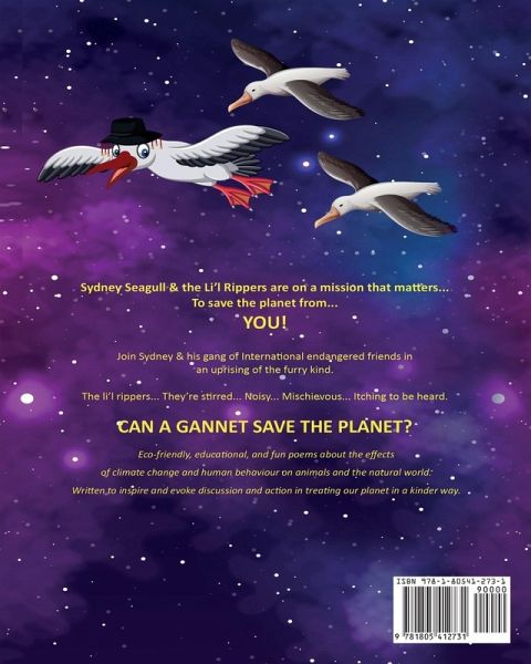 Sydney Seagull & The Li'l Rippers are on a mission that matters... To save the planet from... YOU! Join Sydney and his gang of International endangered friends in an uprising of the furry kind. The li'l rippers... They're stirred... Noisy... Mischievous... Itching to be heard. Listen up, kids, the wake-up call's arrived, time to buckle down, Gonna be a bumpy ride. CAN A GANNET SAVE THE PLANET? Eco-friendly, educational, and fun poems about the effects of climate change and human behaviour on animals and the natural world. Written to inspire and evoke discussion and action in treating our planet in a kinder way.