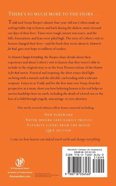 There's so much more to the story. Todd and Sonja Burpo's almost-four-year-old son Colton made an unforgettable trip to heaven and back during the darkest, most-stressed-out days of their lives. Times were tough, money was scarce and the bills, frustrations, and fears were piled high. The story of Colton's visit to heaven changed their lives--and the book they wrote about it, Heaven Is for Real, gave new hope to millions of readers. In Heaven Changes Everything, the Burpos share details about their experience and about Colton's visit to heaven that they weren't able to include in the original story or in the Sony Pictures release of the Heaven Is for Real movie. Practical and inspiring, the short essays shed light on living with a miracle and the afterlife, each ending with a relevant scripture. Listen in as Todd, and for the first time ever Sonja, from her perspective as a mom, show you how believing heaven is for real helps us survive hardships here on earth, including the death of a loved one or the loss of a child through tragedy, miscarriage, or even abortion. This newly revised edition offers bonus material including: New foreword Never-before-seen family photos Favorite scenes from the movie Q&A section Come see how heaven can indeed touch earth and change everything.