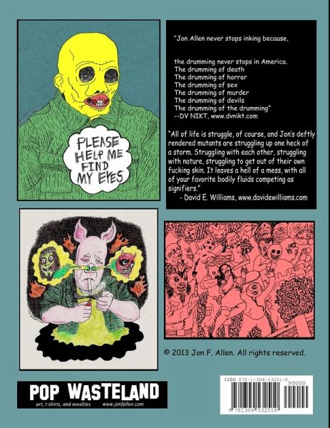 "All of life is struggle, of course, and Jon's deftly rendered mutants are struggling up one heck of a storm. Struggling with each other, struggling with nature, struggling to get out of their own fucking skin. It leaves a hell of a mess, with all of your favorite bodily fluids competing as signifiers." - David E. Williams, www.davidewilliams.com "Black and white drawings as potent, grotesque, and unyielding as the likes of S.Clay Wilson, or Mike Diana. Jon F.Allen dredges up demons, horrors, sex, murder, anxieties, and gallows humor born in the unseemly trenches of Catholicism, addiction, and observations of the decrepit, violent, bleak world around him"- Festus E. Trash
