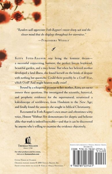 A fascinating personal account of a libertarian feminist agnostic who discovered a dynamic faith. Kitty Foth-Regner was a secular feminist who had bought hook, line, and sinker the ideals and objectives of Betty Friedan's N.O.W. Kitty's mother-a woman of faith-became sick and clearly was destined to die rather quickly. And the author began to wonder about whether she would be in heaven with her mother someday. This led her on a personal journey of faith. Heaven Without Her is Foth-Regner's personal memoir of how she found, to her amazement, that all the evidence points to Christianity.